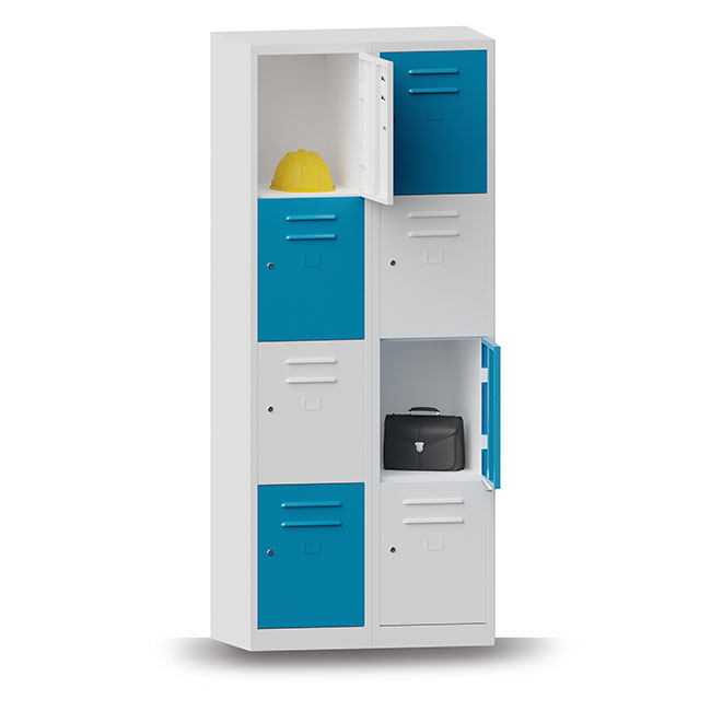2 units four compartment locker cabinets joined together with rivets.